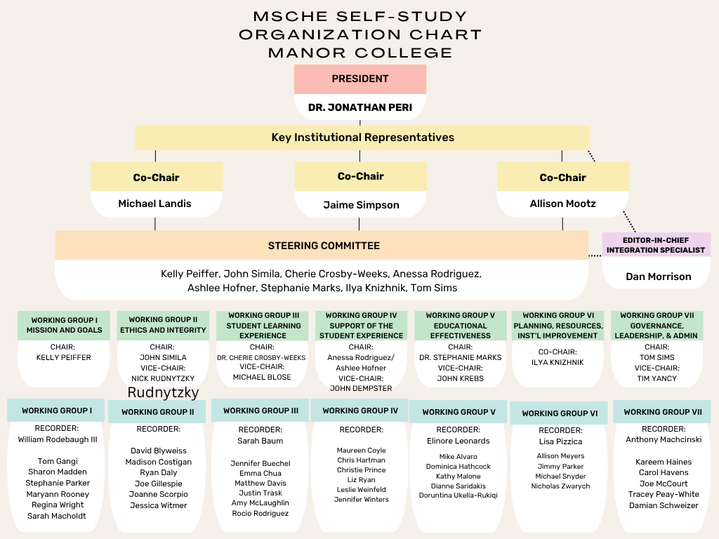 Working Groups are a foundational part of the MSCHE Self-Study process and are established according to an institution’s approach to the Self Study. Manor College is using a Standards-Based Approach to the Self Study report organized around MSCHE’s seven standards for accreditation. As a result, there are seven Working Groups, one for each individual standard.