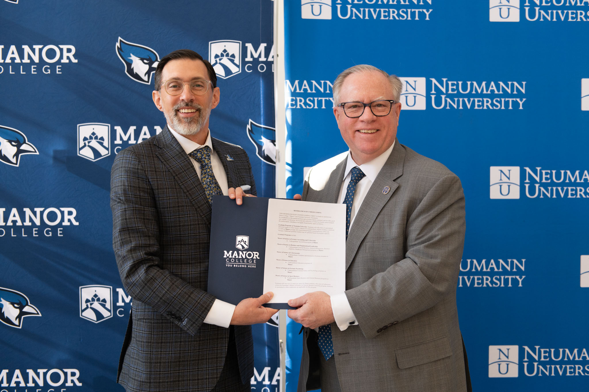 Manor College and Neumann University officially announced a memorandum of understanding for Manor College students to enter graduate programs at Neumann University.